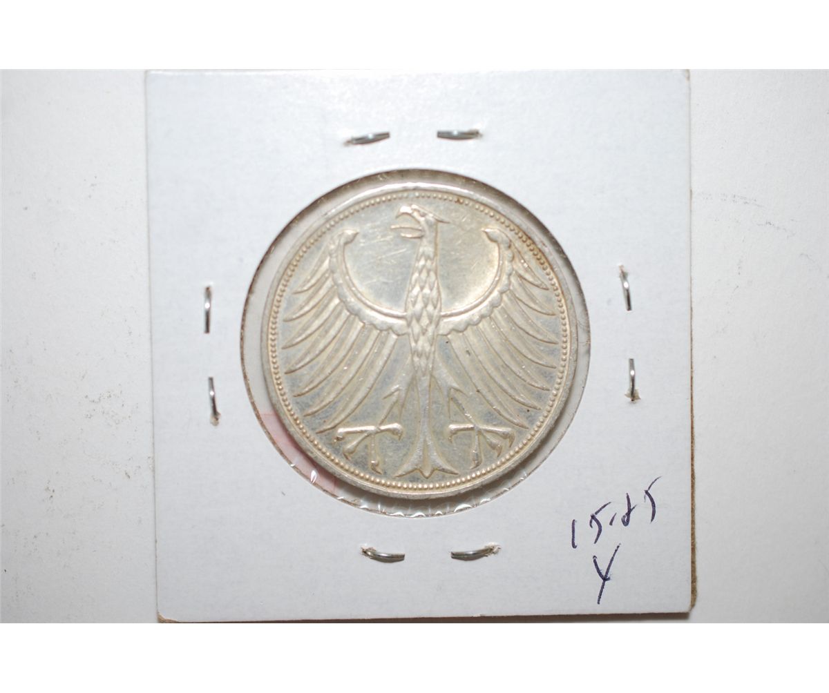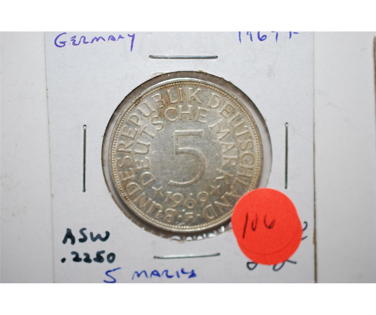 1969-F German 5 Deutsche Mark Foreign Coin; .2250 ASW; EST. $15-25