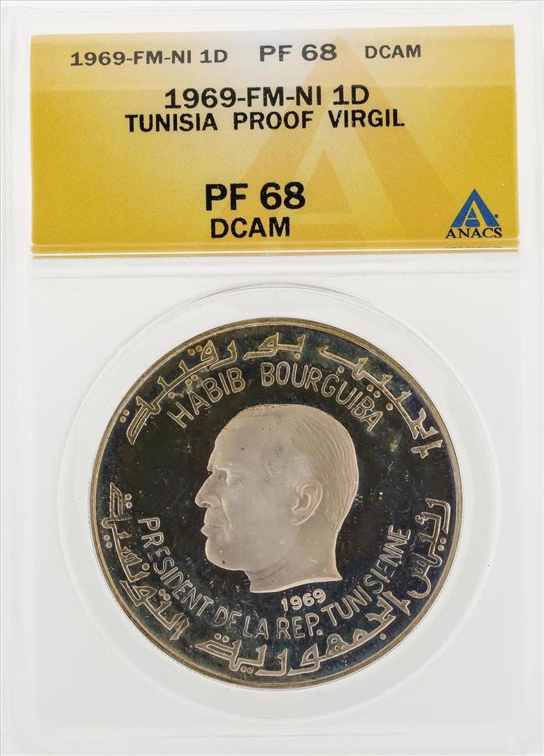 One 1969-FM-NI 1 Dinar Tunisia Proof Virgil Coin ANACS PF68 DCAM. ANACS Certified.