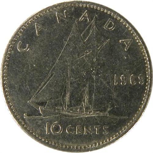 Canada Ten Cents 1969 Large Date ICCS VF-30 Scratch. This is a rare piece with fewer than two dozen examples believed to exist. It has considerable remaining lustre and shallow scratches down the back of the Queen’s neck, and is tied with four others as the sixth highest of only fifteen examples certified by ICCS. PCGS has certified only five examples. Previously sold as Lot 947 in Moore’s ONA 2000 Auction