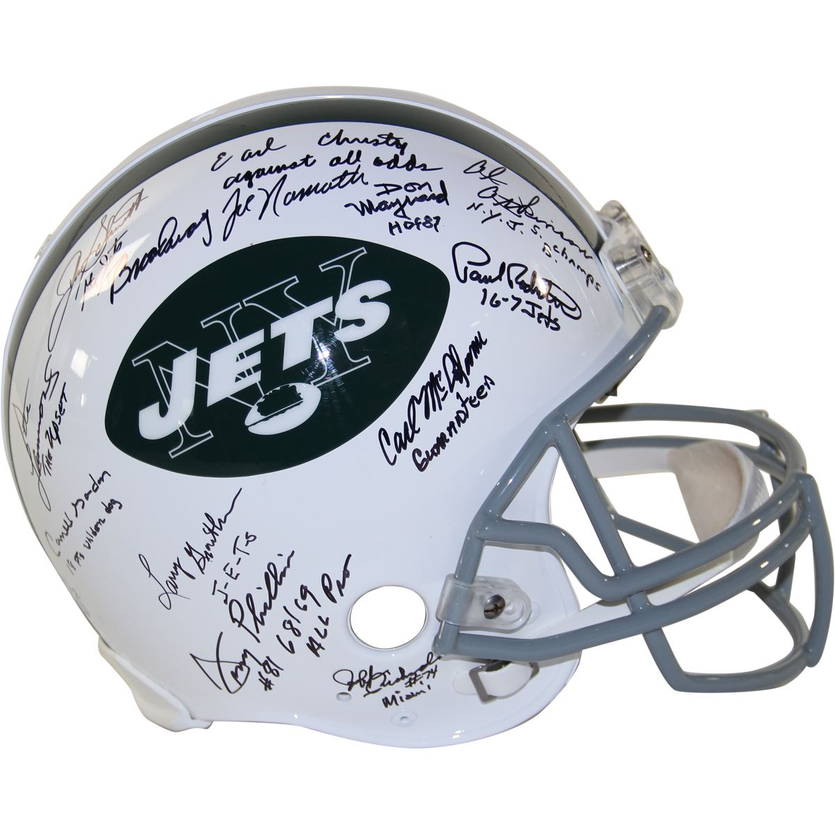 1969 New York Jets Team Signed Authentic 65-77 Throwback Helmet w/ Each Player Inscriptions and "Broadway Joe" Inscribed by Namath (LE/12)