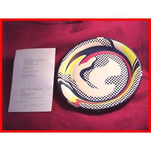 This 10-1/4" in diameter paper plate was done by famous Pop Artist, Roy Lichtenstein in 1969. Printed on the back of the plate "Roy Lichtenstein (Copyrighted) On 1st Inc. 1969". This plate was bought from the artist during a 1977 ceramic exhibit of this artist at California State University at Long Beach. There is an artist signed three-paged exhibit program that comes with the plate. Sold in good condition with slight scuffing and warping of plate.