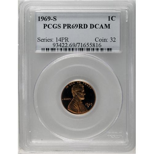 <B>1969-S<1C> PR69 Red Deep Cameo PCGS.</B></I> Deep orange-gold patina envelopes each side of this beautifully cameoed Lincoln proof. The design elements are sharply brought up throughout. A couple of insignificant ticks are noted in the left obverse field. Population: 42 in 69, 0 finer (7/06).<BR><I>From The Empire Tree Collection, Part Two.</B></I>