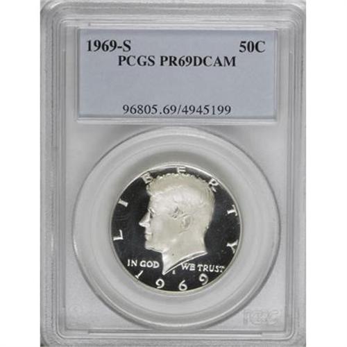 <B>1969-S 50C PR69 Deep Cameo PCGS.</B></I> PCGS Population (468/1). NGC Census: (353/0). Numismedia Wsl. Price for NGC/PCGS coin in PR69: $220. (#96805)<BR><BR><b>Shipping:</b> Coins & Currency (<a target="_blank" href="http://www.heritageauctions.com/common/shipping.php">view shipping information</a>)