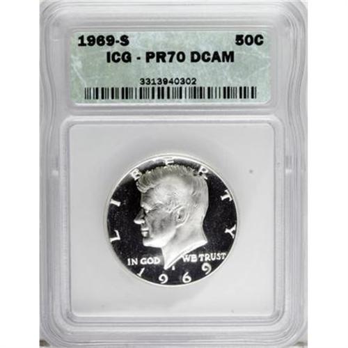 <B>1969-S 50C PR70 Deep Cameo ICG.</B></I> NGC Census: (0/0). PCGS Population (1/0). (#96805)<BR><BR><b>Shipping:</b> Coins & Currency (<a target="_blank" href="http://www.heritageauctions.com/common/shipping.php">view shipping information</a>)