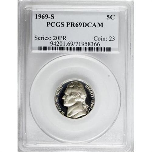 <B>1969-S 5C PR69 Deep Cameo PCGS.</B></I> PCGS Population (64/0). NGC Census: (40/0). Numismedia Wsl. Price for NGC/PCGS coin in PR69: $225. (#94201)<BR><BR><b>Shipping:</b> Coins & Currency (<a target="_blank" href="http://www.heritageauctions.com/common/shipping.php">view shipping information</a>\)