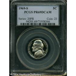 1969-S 5C PR69 Deep Cameo PCGS. This near-perfect <B>1969-S 5C PR69 Deep Cameo PCGS.</B></I> This near-perfect cameo is lightly toned in gold color. Beautiful contrast between the devices and highly reflective fields! Population: 46 in 69, 0 finer (11/04). <BR><BR><B>Important notice:</B> Heritage usually auctions material at the rate of 200-250 lots per hour. On some occasions eBay Live bid software or the Internet may not be able to keep up with the pace of the auction. We recommend placing a realistic absentee bid now as insurance to avoid disappointment. Occasionally the auctioneer may eliminate or reject an eBay Live bid, and the auctioneer may also reopen a lot after the close of the eBay live bidding (usually because we missed an audience bid), and may reject your bid even if it shows you as the winning bidder. By bidding via eBay Live, you agree that Heritage may award the lot to another bidder at its sole discretion under the circumstances described above or any other reasonable circumstances. Since eBay bids are not shown to us until we open the lot on the floor, we treat those bids just like floor bids. In most cases the floor responds before the eBay bid is presented to us, due to Internet lag time, so for consistency we have made it a policy that floor bids are always considered first over tie eBay live bids. Also please note that all Heritage lots purchased through eBay Live carry a 20% Buyer's Premium. Please make sure you read the Terms and Conditions before you bid. This lot is being auctioned in conjunction with a live floor auction by Heritage Galleries & Auctioneers. All final auction and invoice information will be supplied by Heritage Galleries & Auctioneers, and all other information should be considered preliminary. Lot:5656