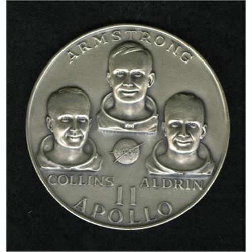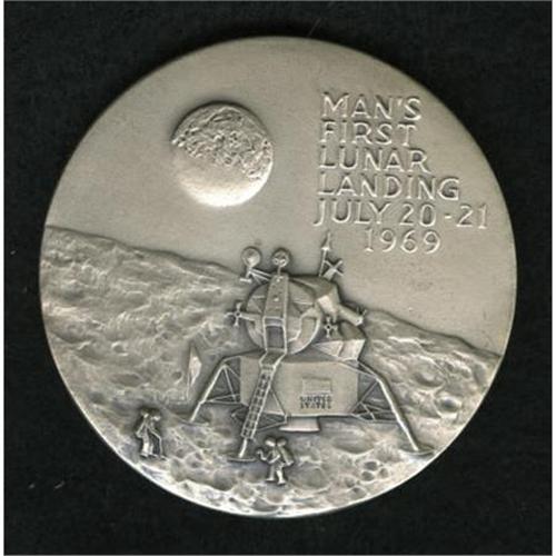 <B>1969 Silver Apollo II Commemorative Medal.</B></I> Silver, .999 fine, 63 mm, 136.3 gm (over 4 oz). Struck by the Medallic Arts Co. to commemorate the crew of Apollo II's "Man's First Lunar Landing July 20-21 1969."<BR><BR><b>Shipping:</b> Coins & Currency (<a target="_blank" href="http://www.heritageauctions.com/common/shipping.php">view shipping information</a>)