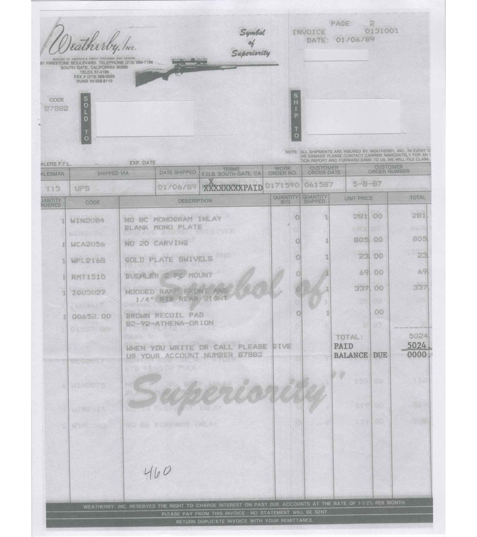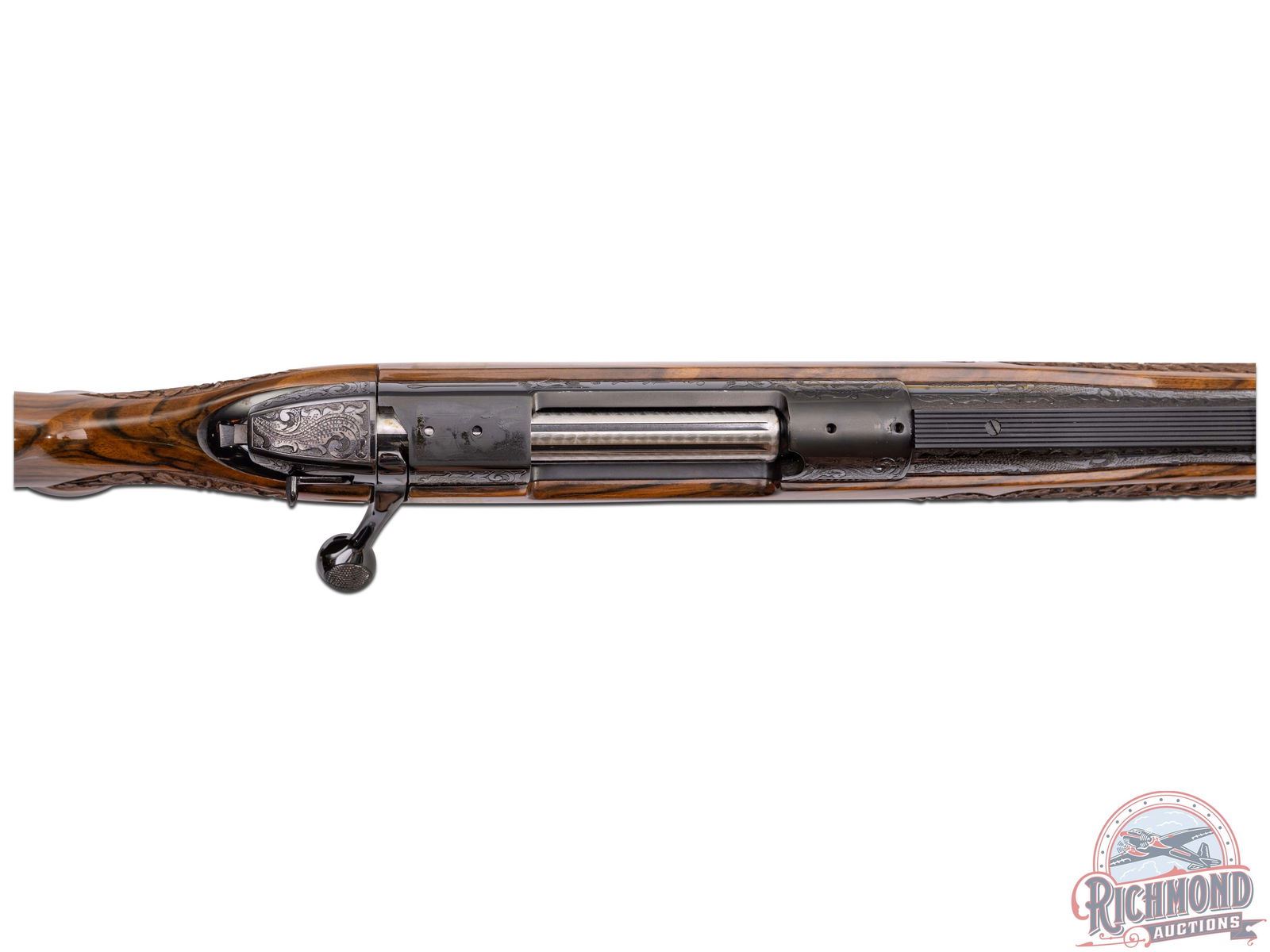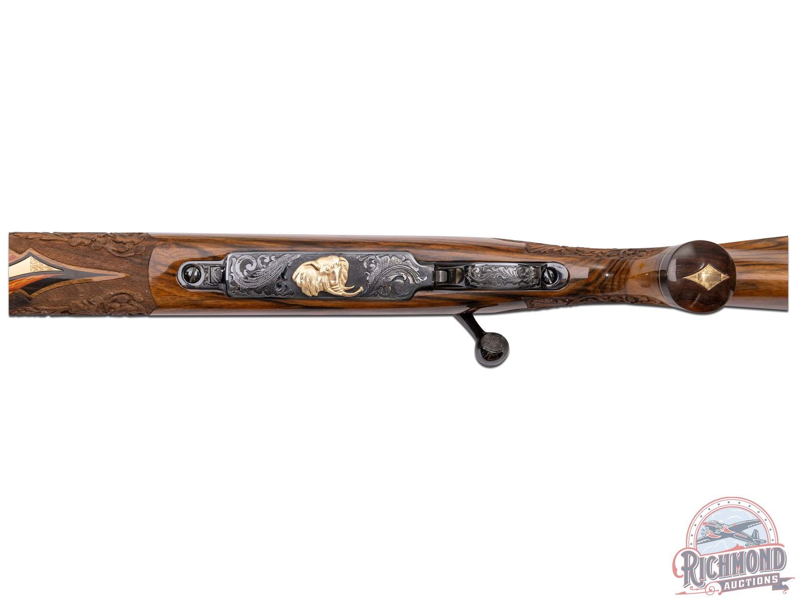 Custom made in West Germany in 1969 and South Gate custom shop engraved. Features a 26" blued round ported barrel with 2-leaf rear notch sight on quarter rib and hooded front sight with brass bead. Barrel has 40% coverage featuring floral scroll engraving that extends 12" from receiver. Receiver has matching engraving with 75% coverage. Top of the receiver is drilled for scope mounts. Blued floorplate has 85% coverage with a gold embossed African elephant bust. Two position safety with jeweled bolt and follower, and knurled bolt knob. Engraved trigger guard with serrated trigger. Heavy grain factory Weatherby 2X walnut Monte Carlo style stock with contrasting rosewood forearm tip and pistol grip cap. Pistol grip features a gold engraved diamond shaped inlay. Deep relief factory carved stock featuring the Weatherby oak leaf and acorn pattern. Bottom of forearm and both sides of the receiver feature a crossed diamond bi-wood inlay consisting of ebony and birch. Bottom of the forearm inlay features a gold engraved inlaid plate. Right side of the stock has an African elephant bust bi-wood inlay of ebony and birch with ivory tusks. Factory gold plate sling studs. Fitted with a Weatherby brown ventilated recoil pad. Includes Weatherby factory paperwork stating all upgrades done in 1989 totaling over $3,300. LOP: 13-3/4". CALIBER: 460 WBY MAG. S/N: P34804. FFL STATUS: Curio & Relic.