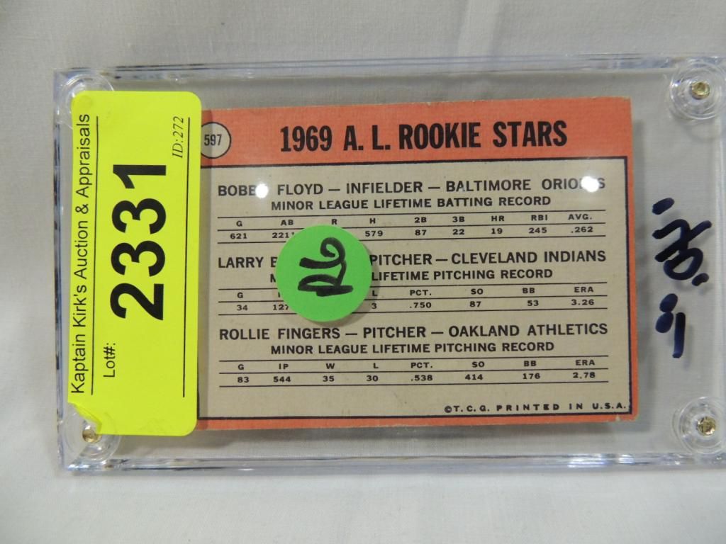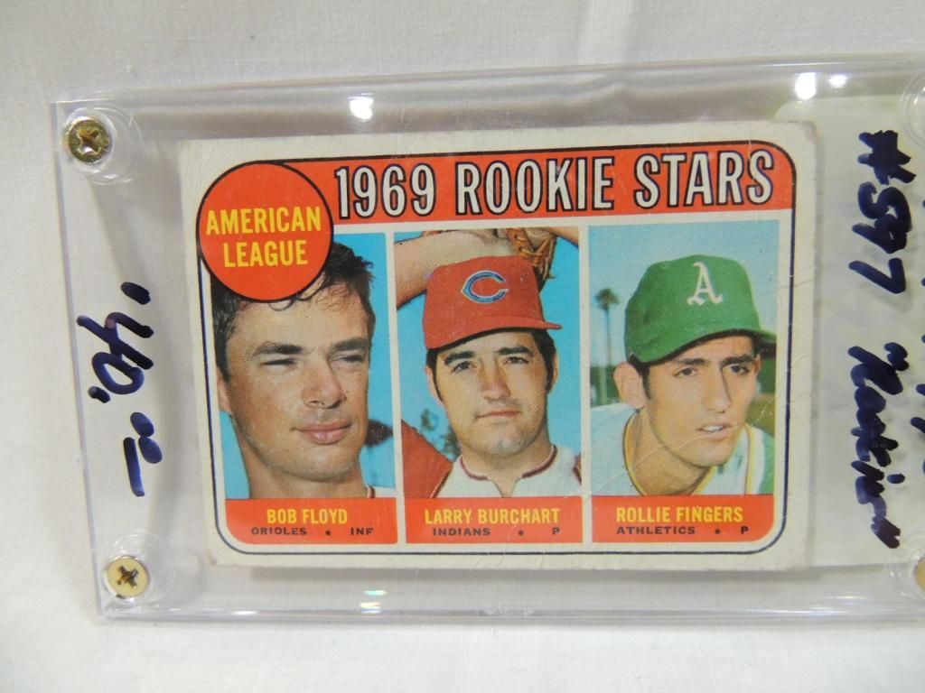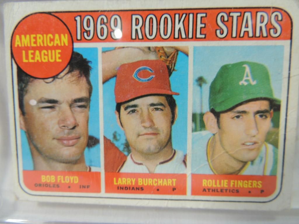 AMERICAN LEAGUE 1969 ROOKIE STARS BOB FLOYD, LARRY BURCHART, ROLLIE FINGERS. BASEBALL PLAYER CARD. BASEBALL TRADING CARDS. VINTAGE CARDS. IN SCREW DOWN CASE. AS SHOWN. SEE PHOTO FOR MORE DETAILS.