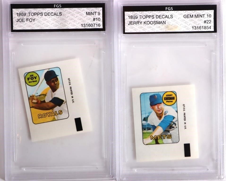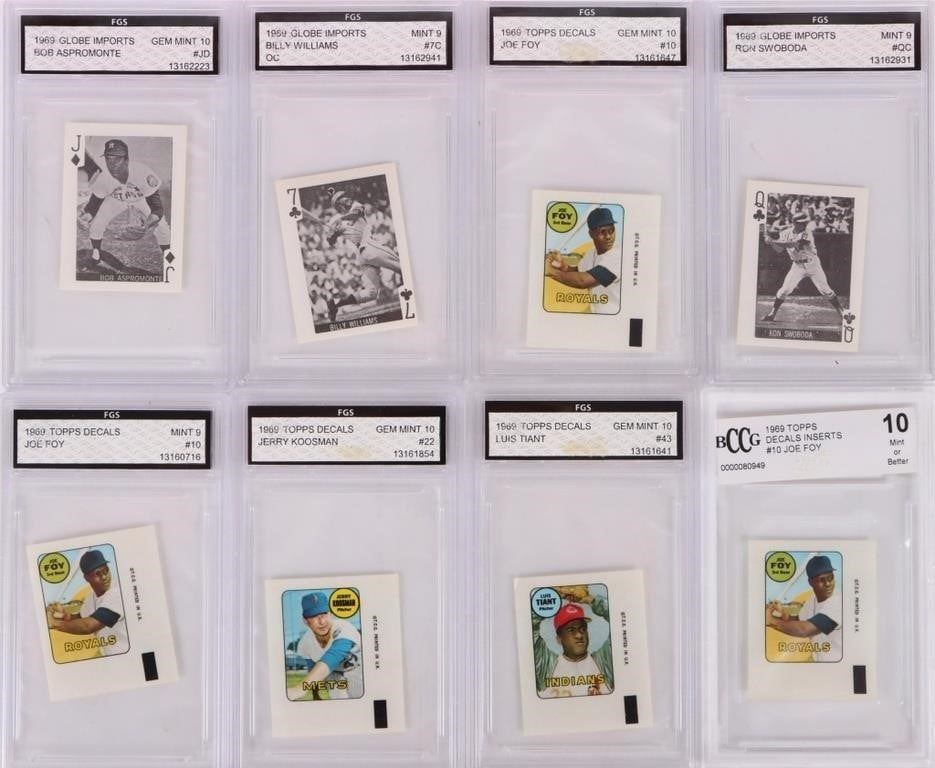 1969 Topps Decals and Globe Imports mint graded cars to include BCCG Topps Decals Inserts #10 Joe Foy, FGS graded Topps Decaks Luis Tiant #43 PSA 10, Topps Decals Jerry Koosman #22 PSA 10, Topps Decals Joe Foy #10 PSA 9, Topps Decals #10 Joe Foy PSA 10, Globe Imports Ron Swoboda #QC PSA 9, Globe Imports Billy Williams OC #7C PSA 9, and Globe Imports Bob Aspromonte #JD PSA 10.
