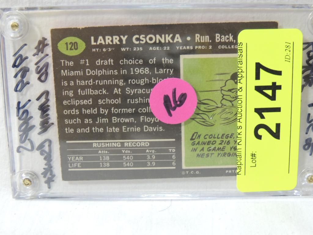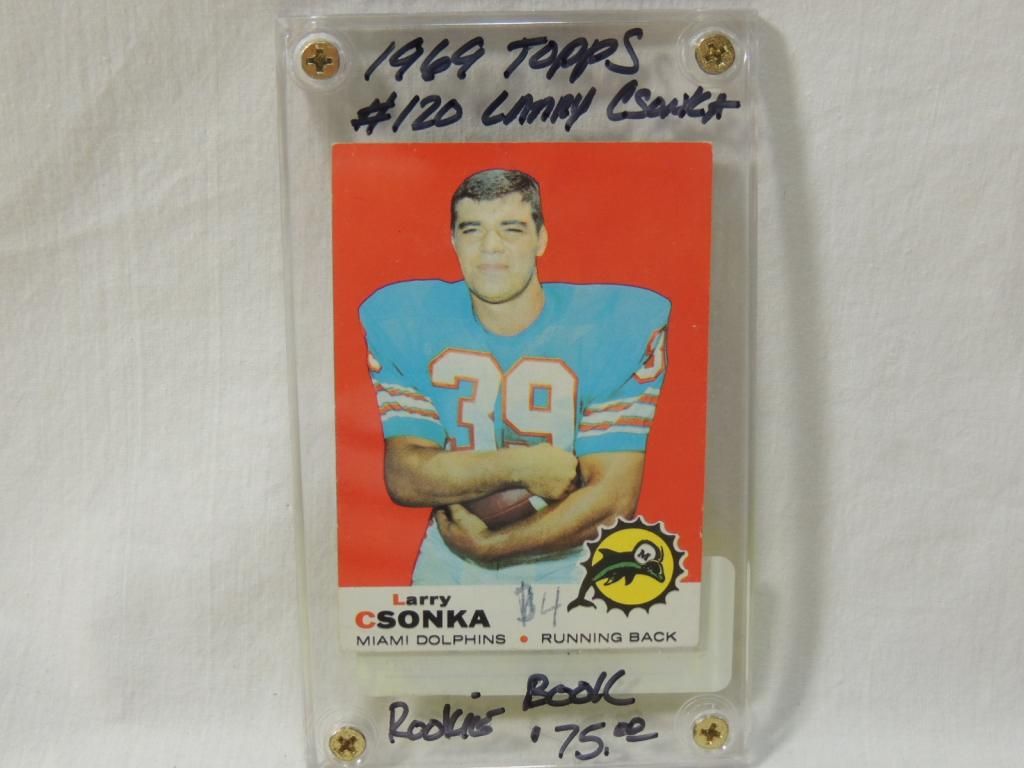 1969 TOPPS LARRY CSONKA #120 FOOTBALL PLAYER CARD. TRADING CARD. FOOTBALL COLLECTIBLES. VINTAGE CARD. IN SCREW DOWN CASE. AS SHOWN. SEE PHOTO FOR MORE DETAILS
