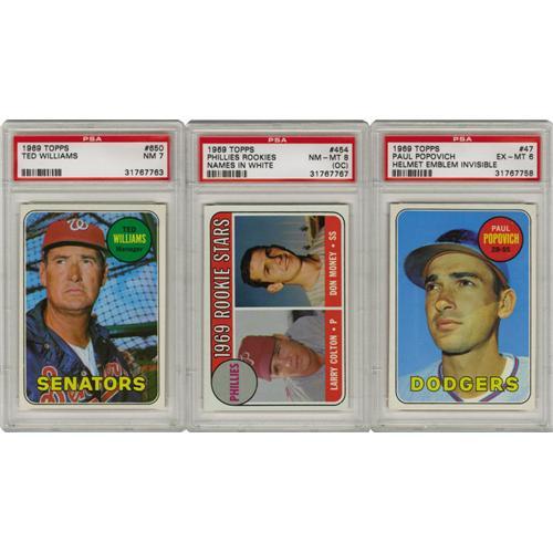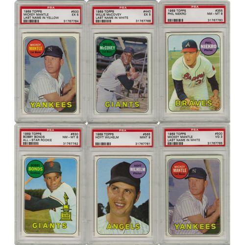 <B>1969 Topps Baseball Complete Set with Variations (693).</B></I> This popular set marks the last card for Mickey Mantle and the first for Reggie Jackson with dozens of Hall of Famers offered in between. A total of nine cards have been graded by PSA with an aggregate SMR value of $612. Graded cards - <B>PSA MT 9:</B></I> #565 Wilhelm; <B>PSA NM-MT 8:</B></I> #355 Niekro, 630 Bonds; <B>PSA NM 7:</B></I> #650 Williams; <B>PSA EX-MT 6:</B></I> #47 Popovich, 454 Phillies Rookies (OC); <B>PSA EX 5:</B></I> # McCovey WL, 500 Mantle; <B>PSA VG 3:</B></I> #500 Mantle WL. Ungraded cards include #20 Banks (EX/MT), 50 Clemente (EX), 95 Bench (EX), 100 Aaron (EX/MT), 120 Rose (EX), 130 Yastrzemski (EX/MT), 190 Mays (VG), 200 Gibson (NM/MT), 255 Carlton (EX), 260 Jackson (VG/EX), 375 Killebrew (VG/EX), 424 Rose AS (VG/EX), 430 Bench AS (EX/MT), 480 Seaver (EX), 485 Perry WL (FR), 510 Carew (EX/MT), 550 Robinson (EX/MT), 597 Fingers (VG). Grades 19% NM to NM/MT, 65% EX to EX/MT and 16% VG to VG/EX (Some lesser).<BR><BR><b>Shipping:</b> Trading Card Set, Medium (<a target="_blank" href="http://www.heritageauctions.com/common/shipping.php">view shipping information</a>)