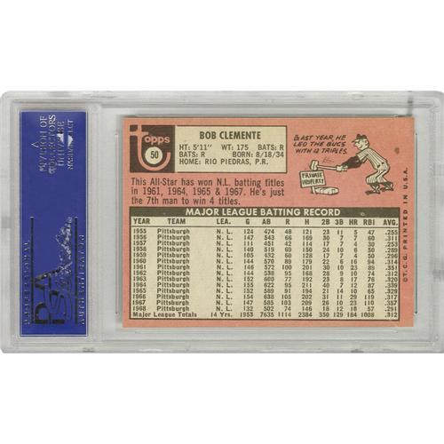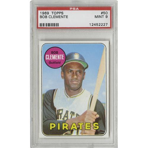 <B>1969 Topps Bob Clemente #50 PSA Mint 9.</B></I> Offered here is an impressive 1969 Topps card with plenty of star appeal. The Puerto Rican displayed a virtuosity that made him one of only four major leaguers to have ten or more Gold Gloves with a lifetime batting average of over .300. Upon inspection of the printing on the front of the card, registration issues which cause the focus of the image to fall below the standards necessary for it to grade higher become evident. <BR><BR><B>Important notice:</B> Heritage usually auctions material at the rate of 200-250 lots per hour. On some occasions eBay Live bid software or the Internet may not be able to keep up with the pace of the auction. We recommend placing a realistic absentee bid now as insurance to avoid disappointment. Occasionally the auctioneer may eliminate or reject an eBay Live bid, and the auctioneer may also reopen a lot after the close of the eBay live bidding (usually because we missed an audience bid), and may reject your bid even if it shows you as the winning bidder. By bidding via eBay Live, you agree that Heritage may award the lot to another bidder at its sole discretion under the circumstances described above or any other reasonable circumstances. Since eBay bids are not shown to us until we open the lot on the floor, we treat those bids just like floor bids. In most cases the floor responds before the eBay bid is presented to us, due to Internet lag time, so for consistency we have made it a policy that floor bids are always considered first over tie eBay live bids. Also please note that all Heritage lots purchased through eBay Live carry a 22.5% Buyer's Premium. Please make sure you read the Terms and Conditions before you bid. This lot is being auctioned in conjunction with a live floor auction by Heritage Galleries & Auctioneers. All final auction and invoice information will be supplied by Heritage Galleries & Auctioneers, and all other information should be considered preliminary. Lot:19622 <BR><BR><B>Winning Notification and Billing:</B> After the FINAL session in this auction is complete, Heritage will send e-mail and snail mail invoices. This process normally takes several days. All final auction and invoice information will be supplied by Heritage Galleries & Auctioneers, and all other information should be considered preliminary. <BR><BR>This auction will be conducted on a live auction floor and over the Internet through eBay Live. If you choose to place an absentee bid, please take a moment to <font color='#0000ff'><u><a href='http://pages.ebay.com/liveauctions/help/before/laabsentee.html'>learn how eBay Live absentee bidding works</a></u></font><font color='#000000'>