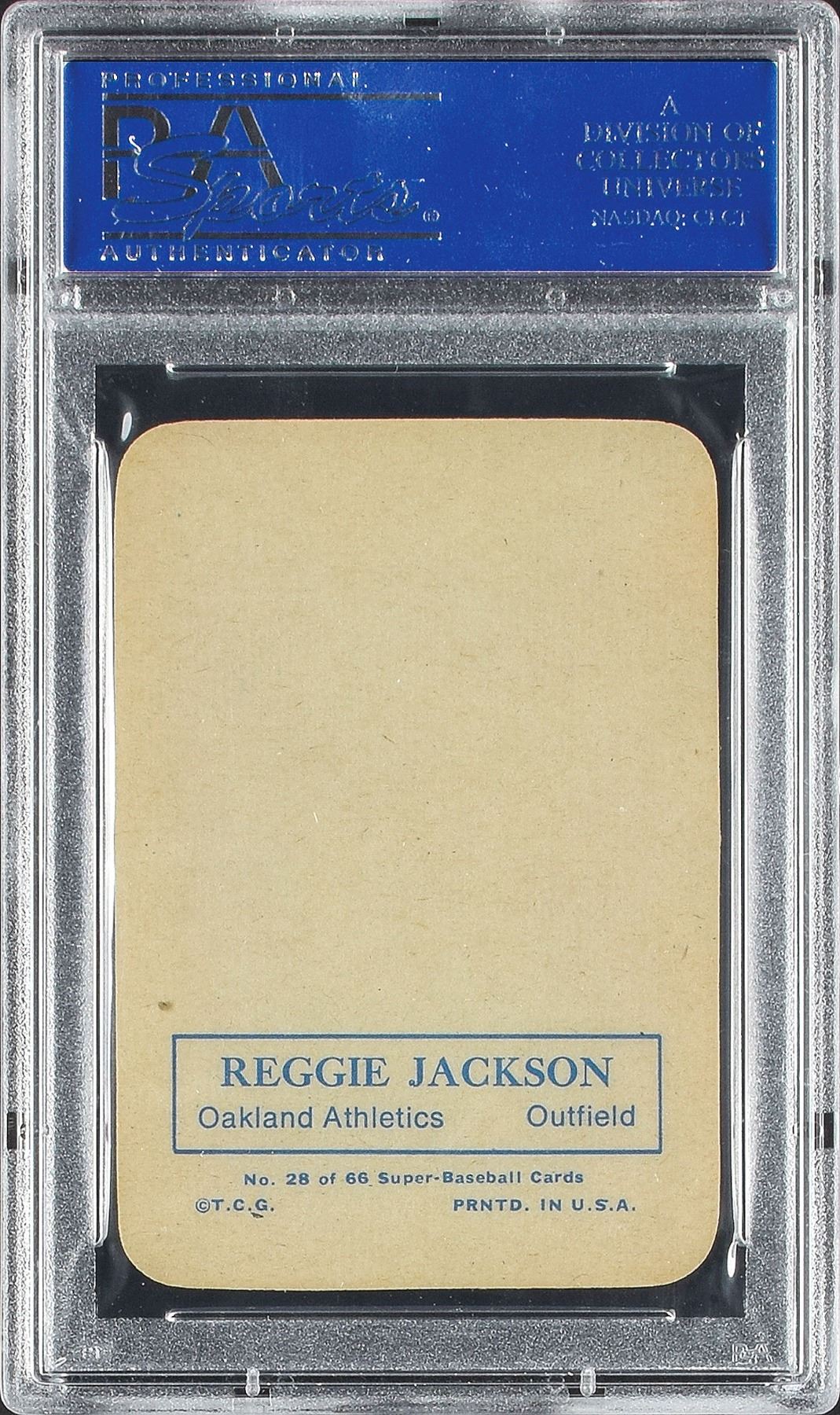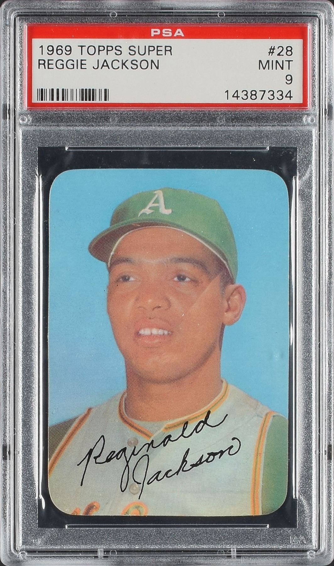 Graded by PSA MINT 9. The Topps company was always attempting to develop new strategies to sell more cards, and one method was through testing certain types of new cards in smaller markets, and if demand was sufficient then the company would produce larger amounts of the same type set during the following year or two. One such example was with the 1969 Topps Super set. Comprising 60 cards, round-cornered, with a simple no-border up-close image and facsimile autograph. They were the 'test issue' for the larger Super cards produced in 1970 and 1971. However, the 1969 cards, while smaller in stature, are so much more in demand. The Reggie Jackson Super Rookie card, which used the same image as his regular issue rookie is one of the key cards in the set. This example has brilliant color and smooth surfaces front and back. MINT in every respect.