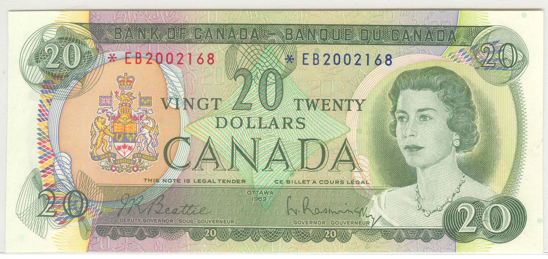 1969 Twenty Dollars Replacement, BC-50aA, GEM UNC, Beattie Rasminsky, serial *EB2002168.