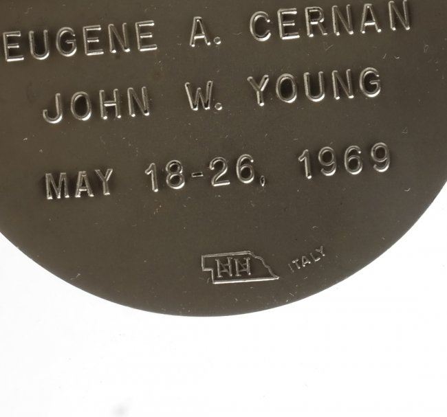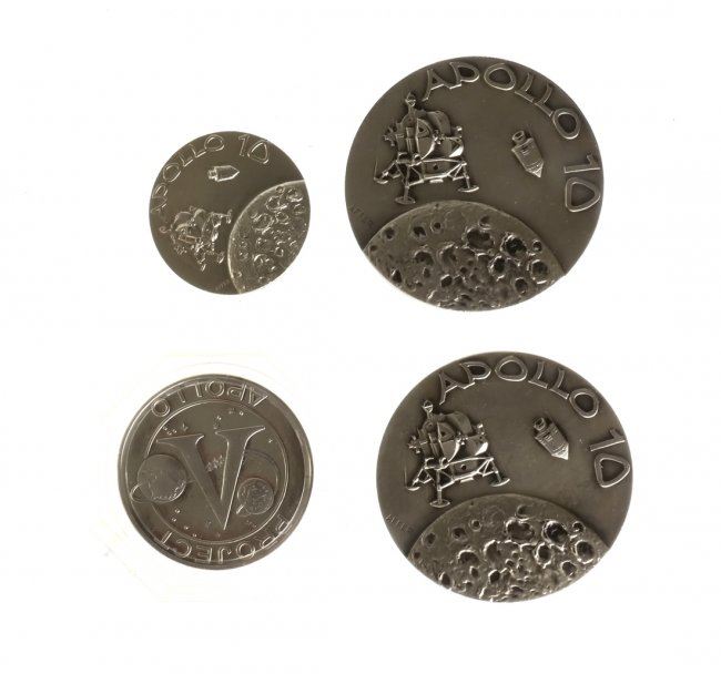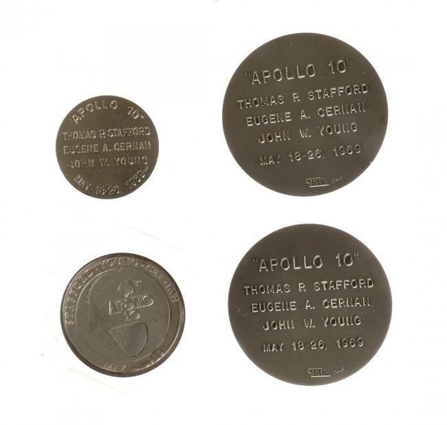 [NASA Space Exploration] Apollo 10 large group of medals. Comprises: 1.) Eight Franklin Mint boxed proof sets commemorating the May 18, 1969 Space Flight of Thomas A. Stafford, Eugene A. Cernan, and John W. Young. Each set contains five medals in various base metal alloys. All measure 38mm. Some toning. 2.) Approximately 181 Franklin Mint silver-plated medals in plastic cases. Each medal, 38mm. 3.) Sterling silver medal by Costantino Affer. 32mm. Accompanied by two larger white metal versions by Affer. Each 50mm. 4.) Franklin Mint .999 fine silver medal. 38mm. Mostly proof condition, some with toning and oxidation. Total silver weight of lot 1.43ozt, 44.5dwt.