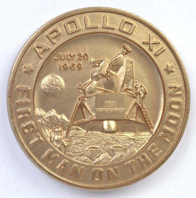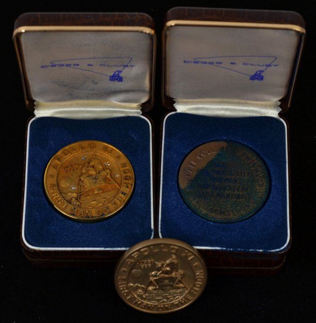 [NASA Space Exploration] U.S. Apollo 11 gold-filled medal and others. Comprising two First Man on the Moon, produced by Dieges & Clust of Providence, stamped "1/10 10k GF". Features four inset mine-cut clear stones. Accompanied by two patinated bronze duplicates. All medals measure 56mm. All bear corrosion on edges and reverse from presentation box material.