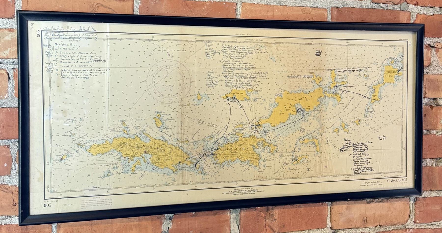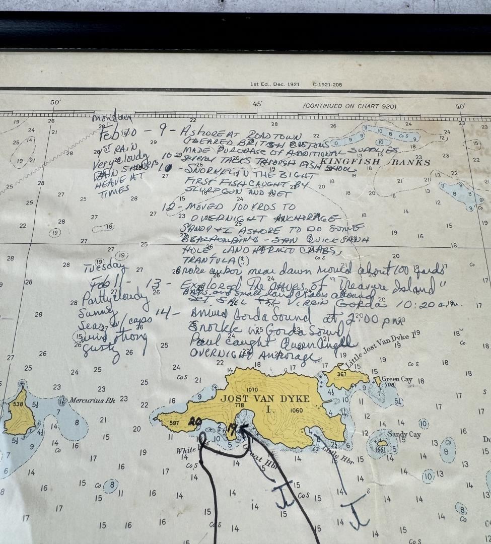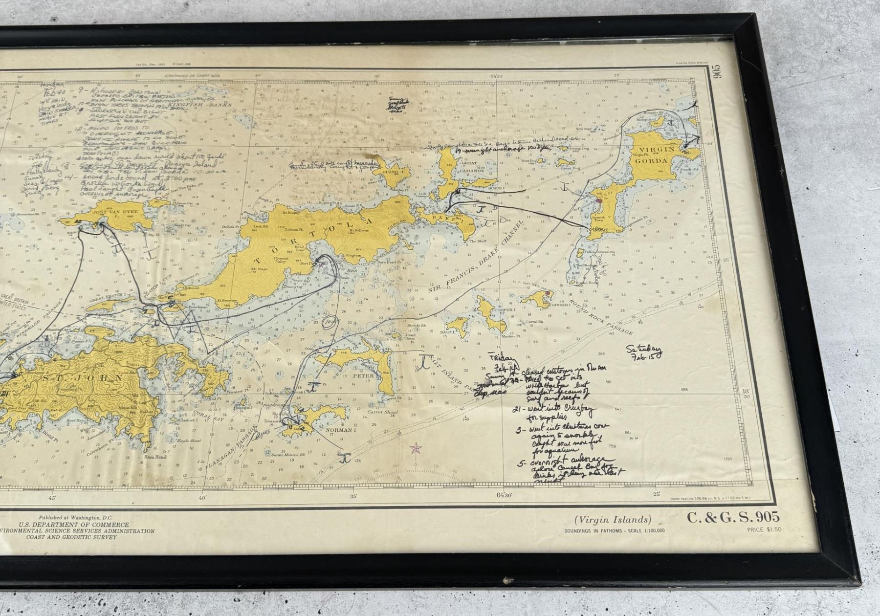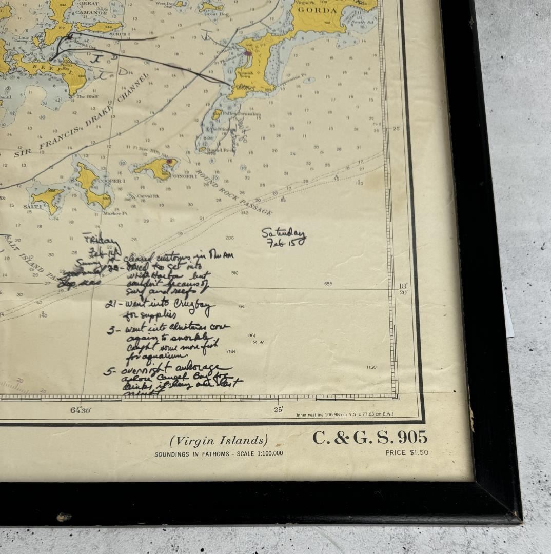 Interesting map with trip notes. 16" by 34 1/2" framed.