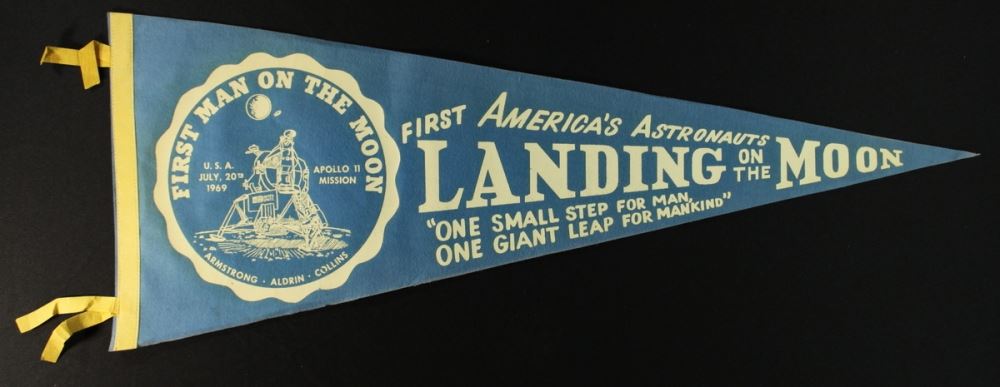 This vintage full-size pennant measures 30" in length and commemorates the Apollo 11 NASA moon landing. Produced in 1969. This piece is vintage and is an authentic original pennant commemorating the first moon landing. The pennant features the Apollo 11 mission image (astronauts: Neil Armstrong, Buzz Aldrin and Michael Collins).