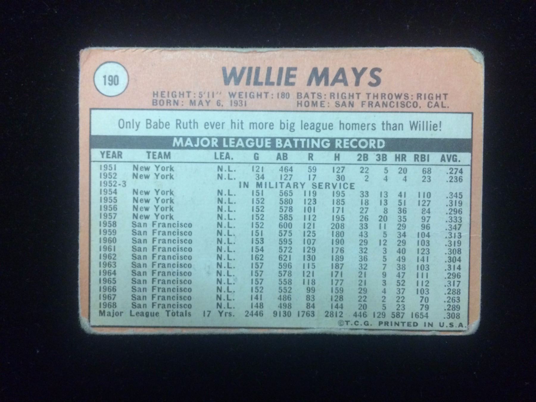 1969 WILLIE MAYS #190 TOPPS BASEBALL TRADING CARD