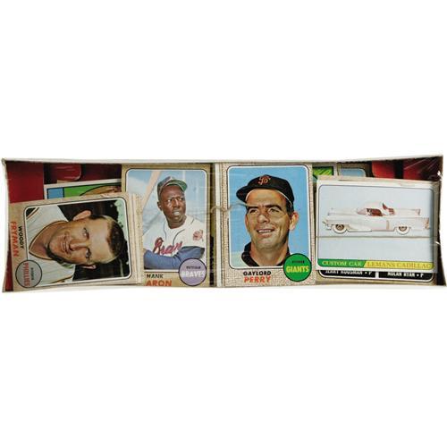 <B>1969 "Win-A-Card" Board Game with Unopened Topps Cards.</B></I> A mystery was recently solved when it was discovered that the rare yellow-back variation of 1968 Topps Baseball cards actually derive from this scarce Milton Bradley board game. Each game was packaged with the odd assortment of seventy-six 1968 Topps Baseball, thirty-three 1967 Topps Football, and twenty-two 1965 Topps Hot Rod cards. Here we present an incredibly rare find, a complete "Win-A-Card" game with the card package still sealed. Age has caused some of the rubber bands that secured the cards to snap, as should be visible in the photos, but this has allowed us to spot a Hank Aaron card in the mix. And as it is established that this game offers only first and second series Baseball cards, the Nolan Ryan rookie is a possibility. The football offerings might include a rookie Joe Namath as well. A bit of edge damage on the top cards is evident from the use of rubber bands, but most appear to be in fine shape. The game itself has some separation at one corner of the box top, but is otherwise very strong as well. Who knows what treasures may lurk inside?<BR><BR><b>Shipping:</b> Miscellaneous Collectibles, Larg (<a target="_blank" href="http://www.heritageauctions.com/common/shipping.php">view shipping information</a>)