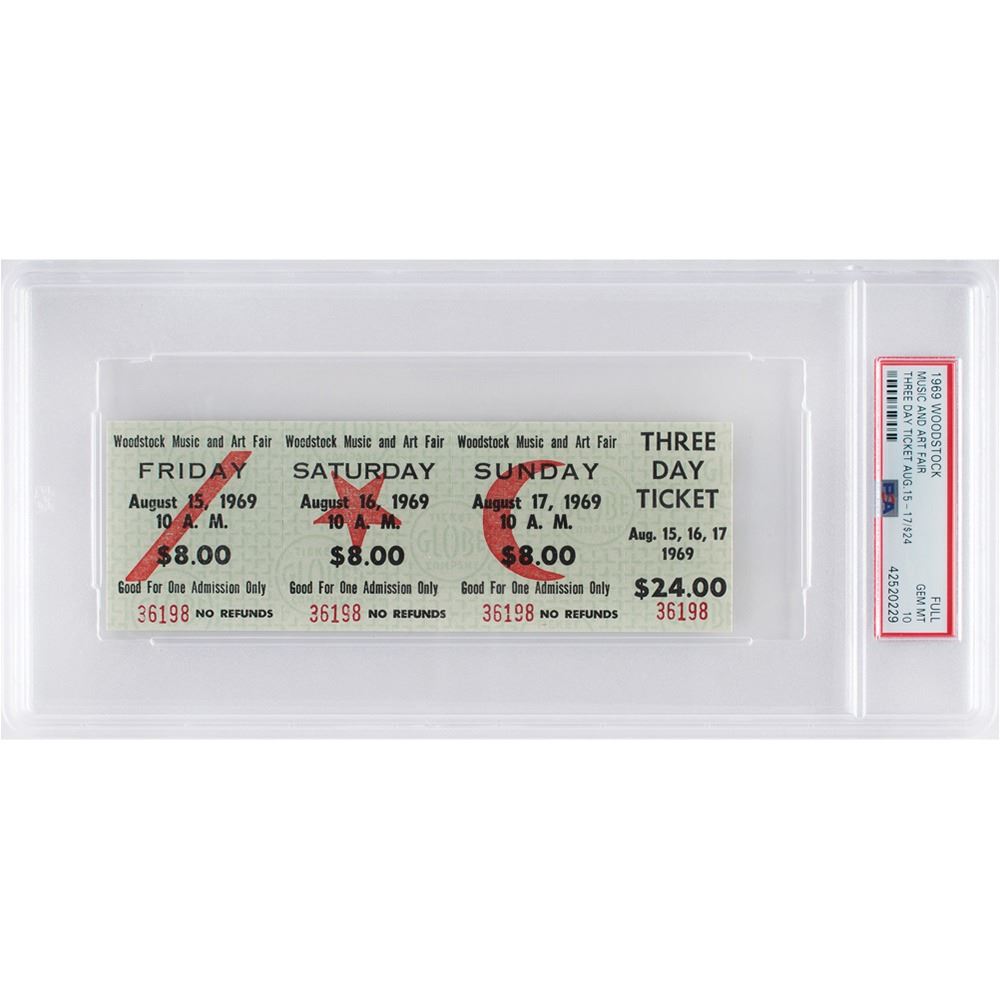 Original unused three-day admission ticket for the iconic Woodstock Music and Art Fair, 6 x 2, issued for August 15-17, 1969, numbered "36198." Encapsulated and graded by PSA/DNA as "GEM MT 10." In fine condition.