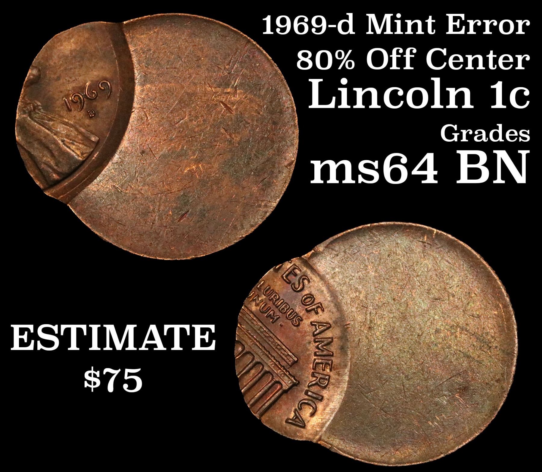 1969-d Mint Error '80% off center' Lincoln Cent 1c Grades Choice Unc BN.