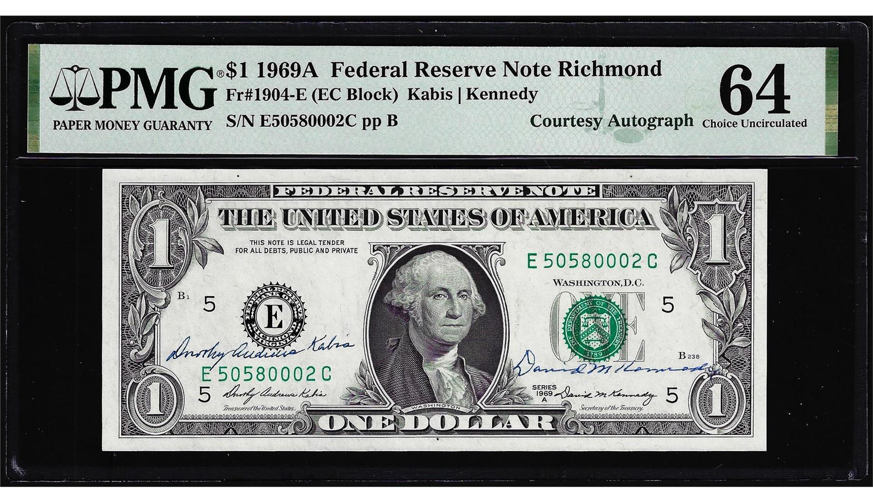 1969A $1 Federal Reserve Note PMG Choice Uncirculated 64 Dual Courtesy Autograph