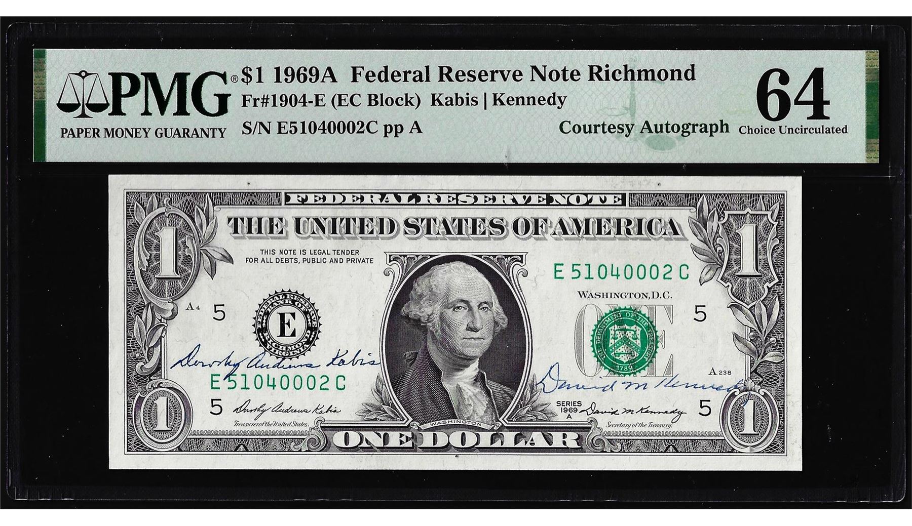 1969A $1 Federal Reserve Note PMG Choice Uncirculated 64 Dual Courtesy Autograph