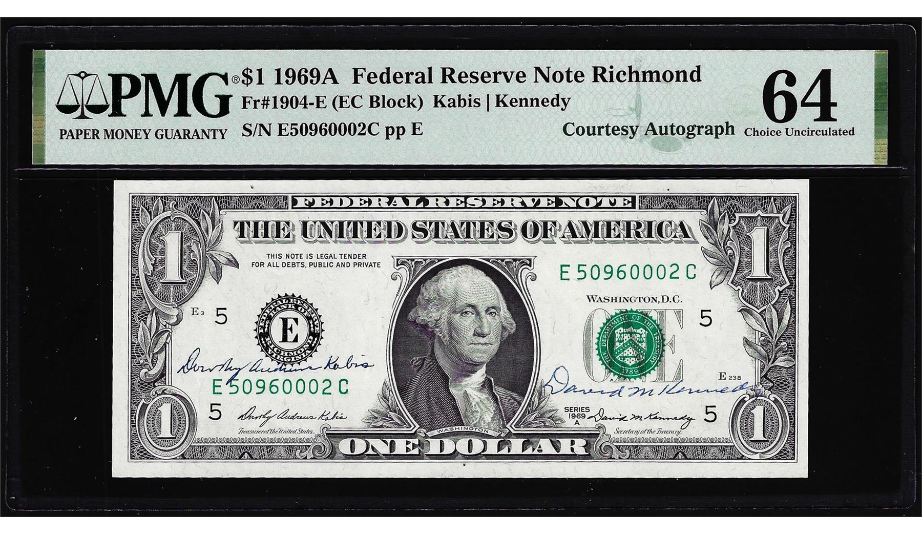 1969A $1 Federal Reserve Note PMG Choice Uncirculated 64 Dual Courtesy Autograph
