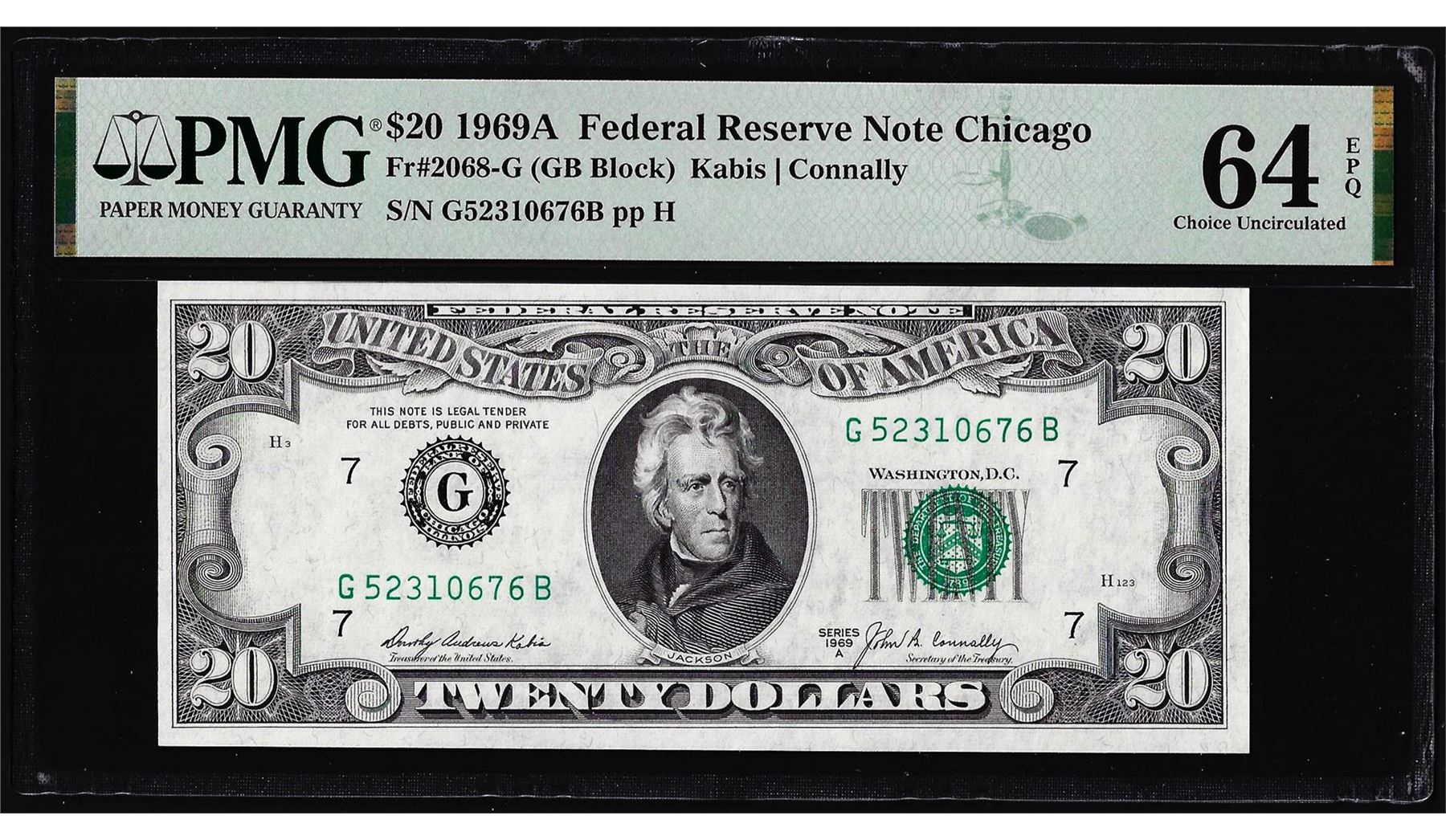 One 1969A $20 Federal Reserve Note Chicago Fr.2068-G PMG Choice Uncirculated 64EPQ. PMG Certified.