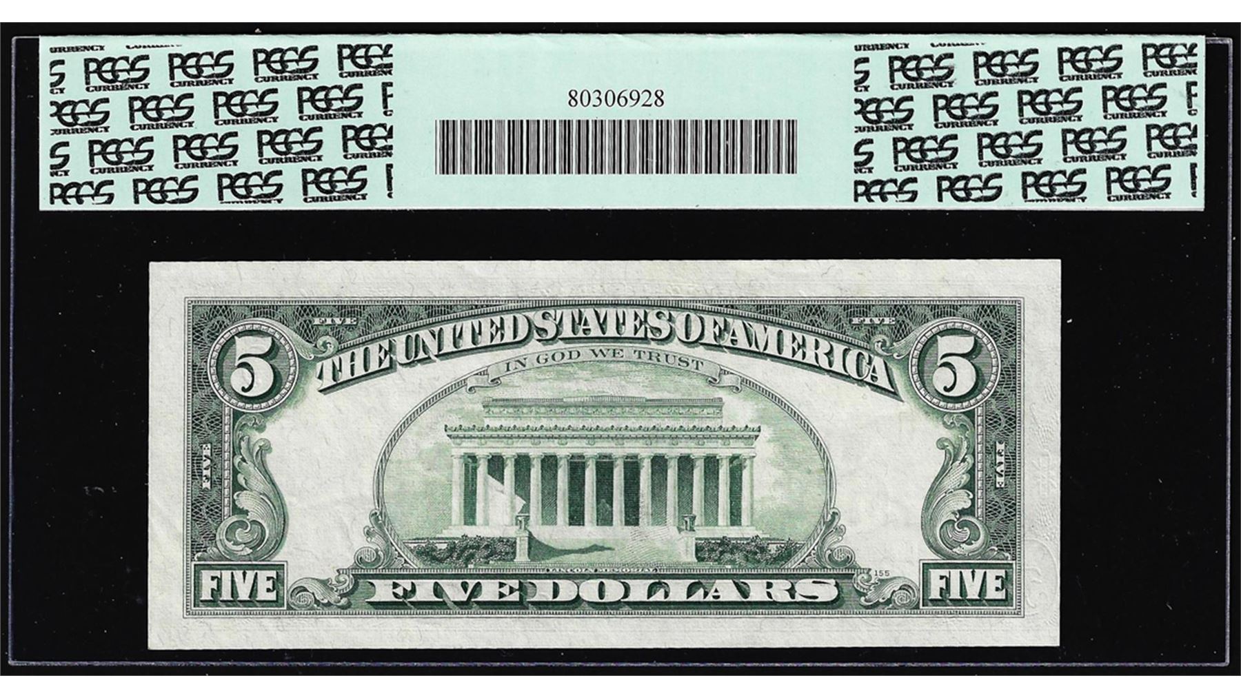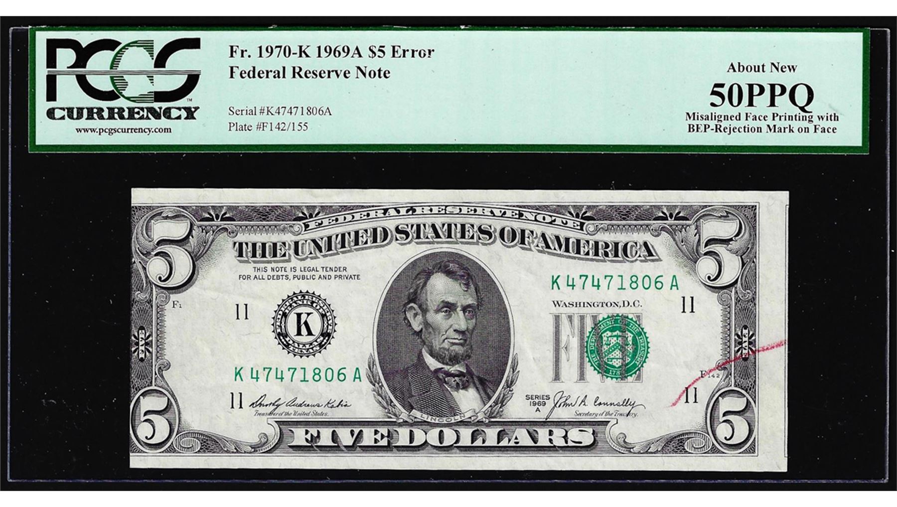 One 1969A $5 Federal Reserve Note Misaligned Face Printing ERROR w/ BEP Mark PCGS About New 50PPQ. PCGS Graded.