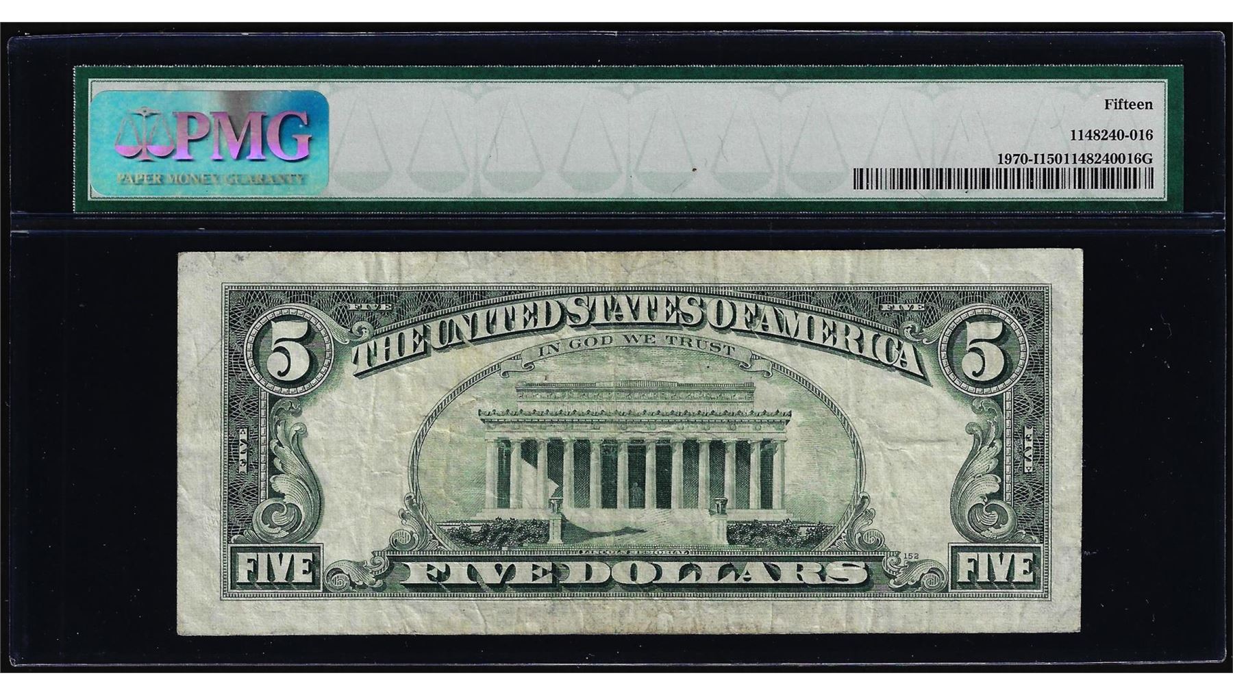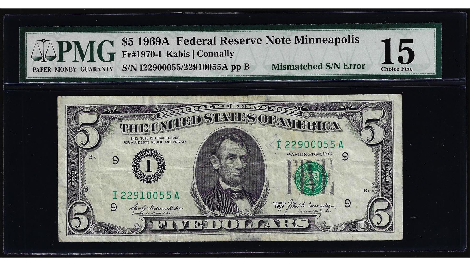 One 1969A $5 Federal Reserve Note Mismatched Serial Number Error Fr.1970-I PMG Ch. Fine 15. PMG Certified.
