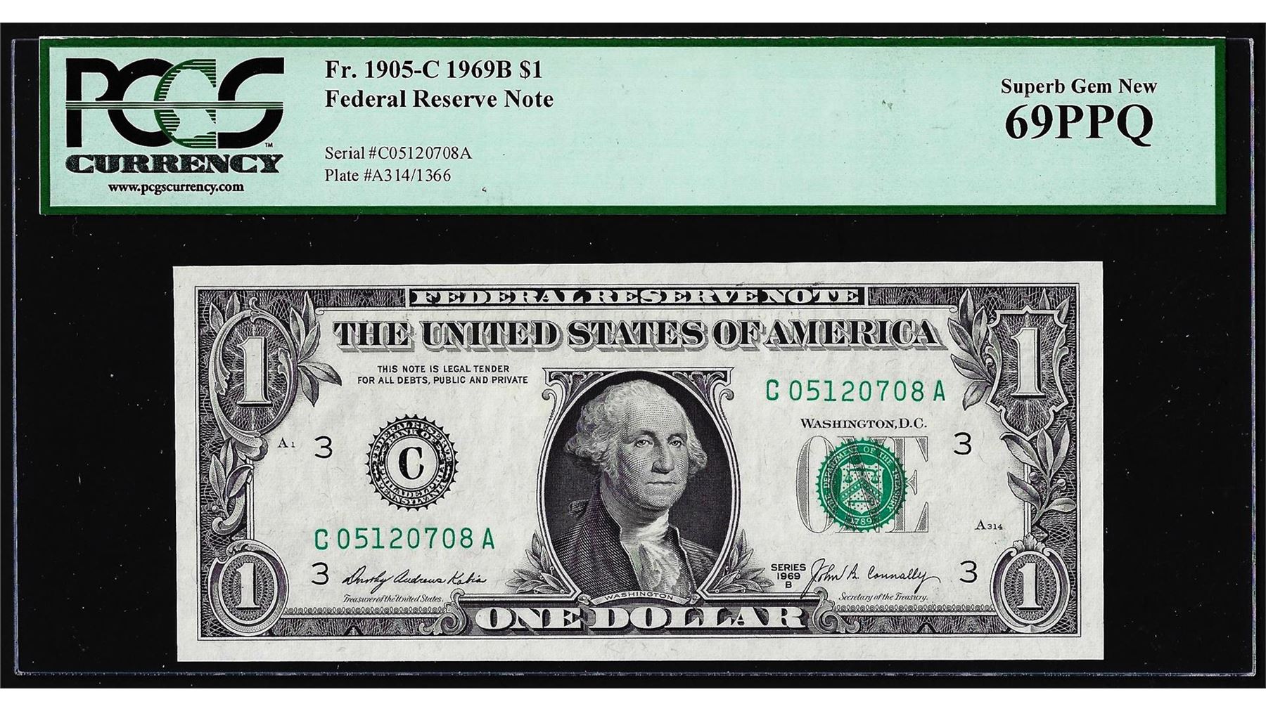 One 1969B $1 Federal Reserve Note Fr.1905-C PCGS Superb Gem New 69PPQ. PCGS Graded.