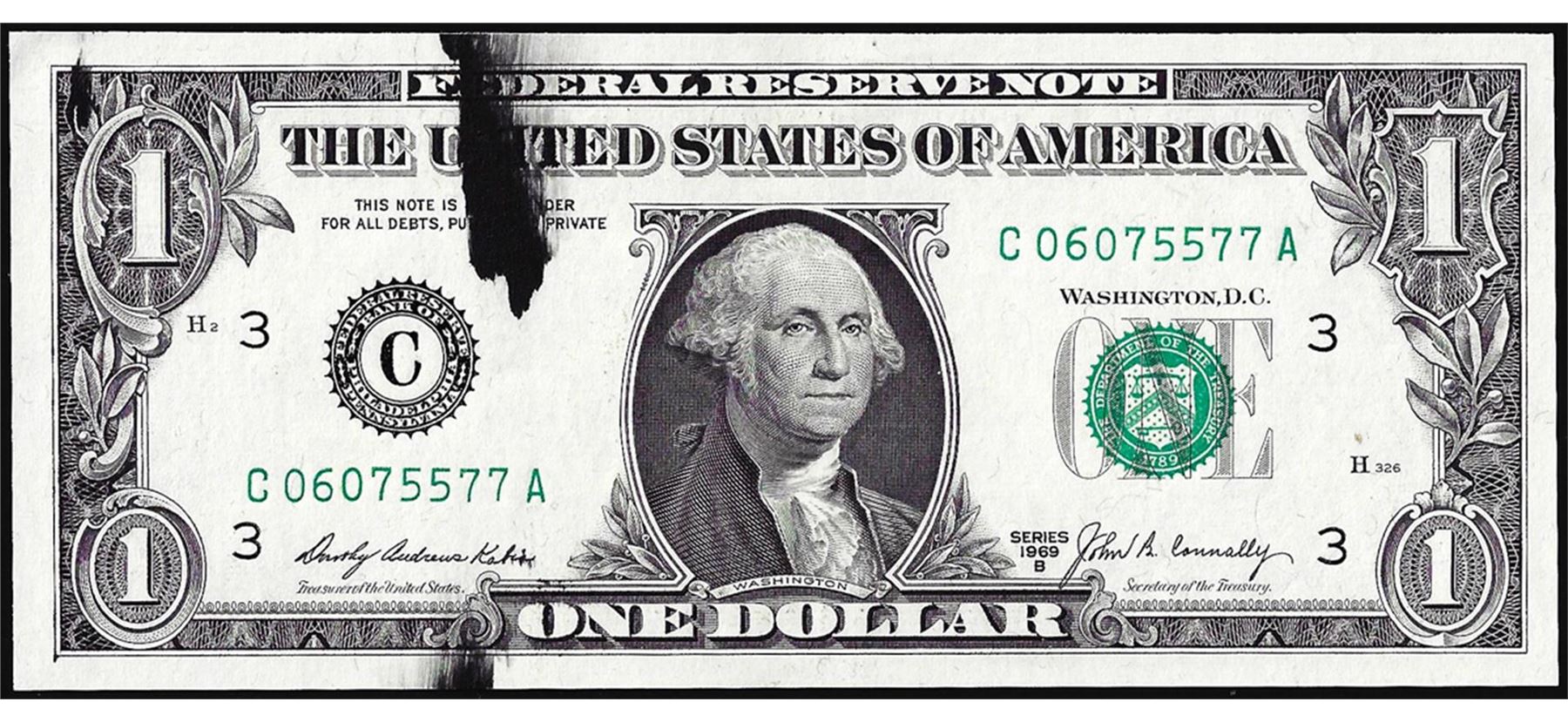 One 1969B $1 Federal Reserve Note Ink Smear ERROR.