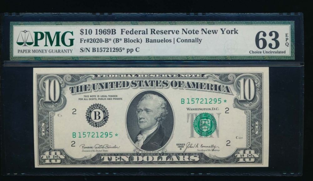 One 1969B $10 New York Federal Reserve Star Note PMG 63EPQ.