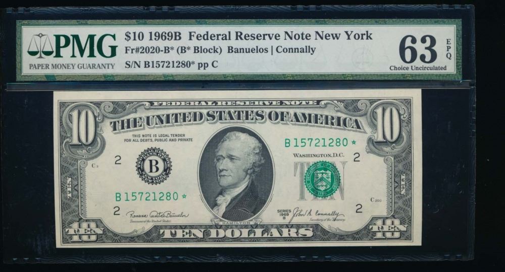 One 1969B $10 New York Federal Reserve Star Note PMG 63EPQ.