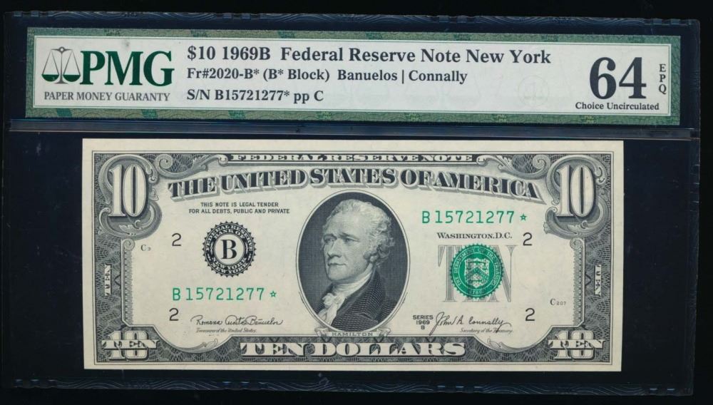 One 1969B $10 New York Federal Reserve Star Note PMG 64EPQ.