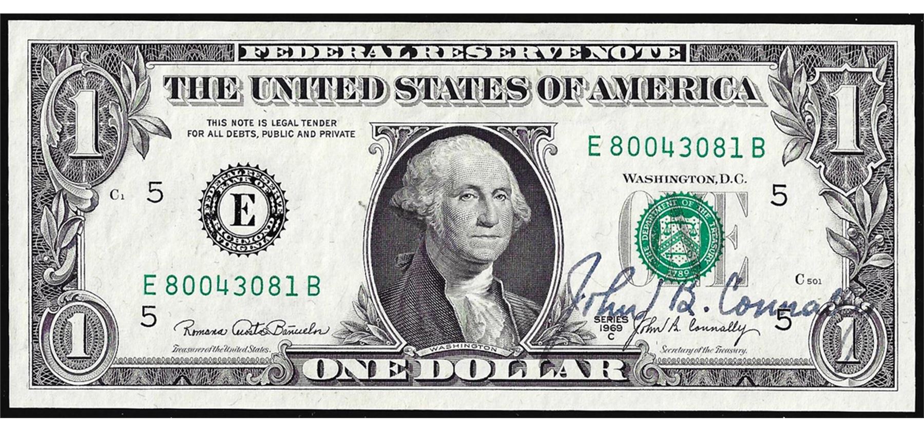 One 1969C $1 Federal Reserve Note with Courtesy Autograph.
