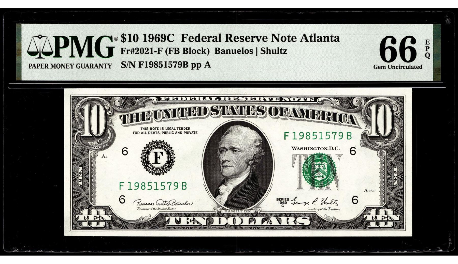 1969C $10 Federal Reserve Note Atlanta Fr.2021-F PMG Gem Uncirculated 66EPQ