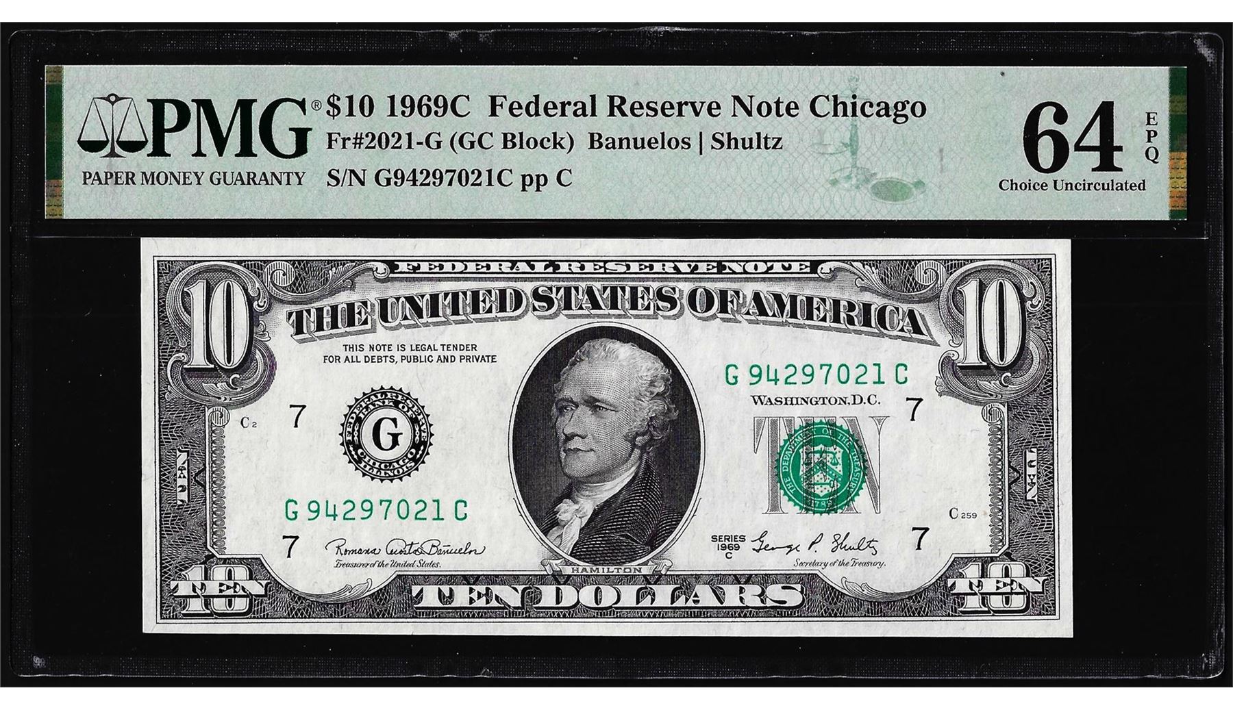 One 1969C $10 Federal Reserve Note Chicago Fr.2021-G PMG Choice Uncirculated 64EPQ. PMG Certified.