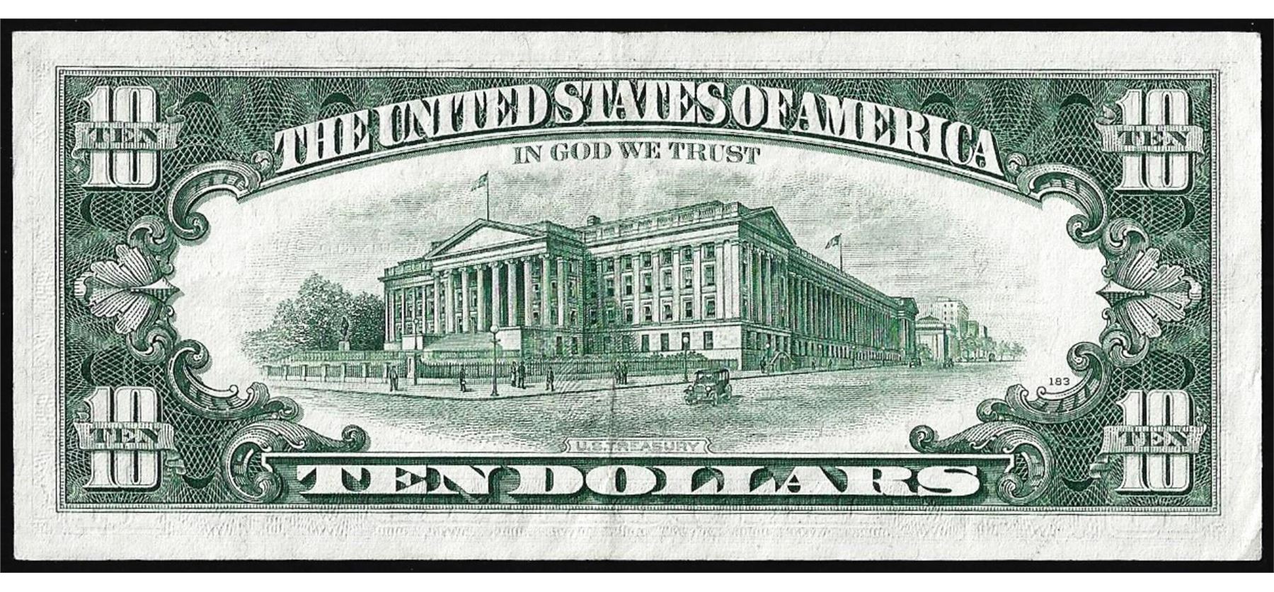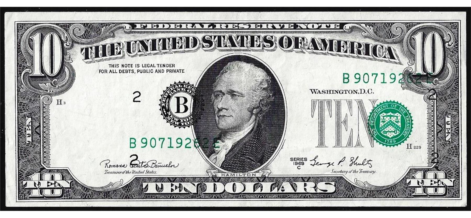 One 1969C $10 Federal Reserve Note New York Shifted Third Print Error.