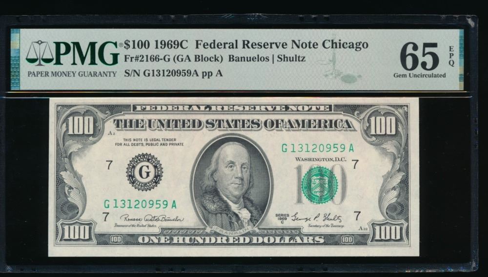 One 1969C $100 Chicago FRN PMG 65EPQ.
