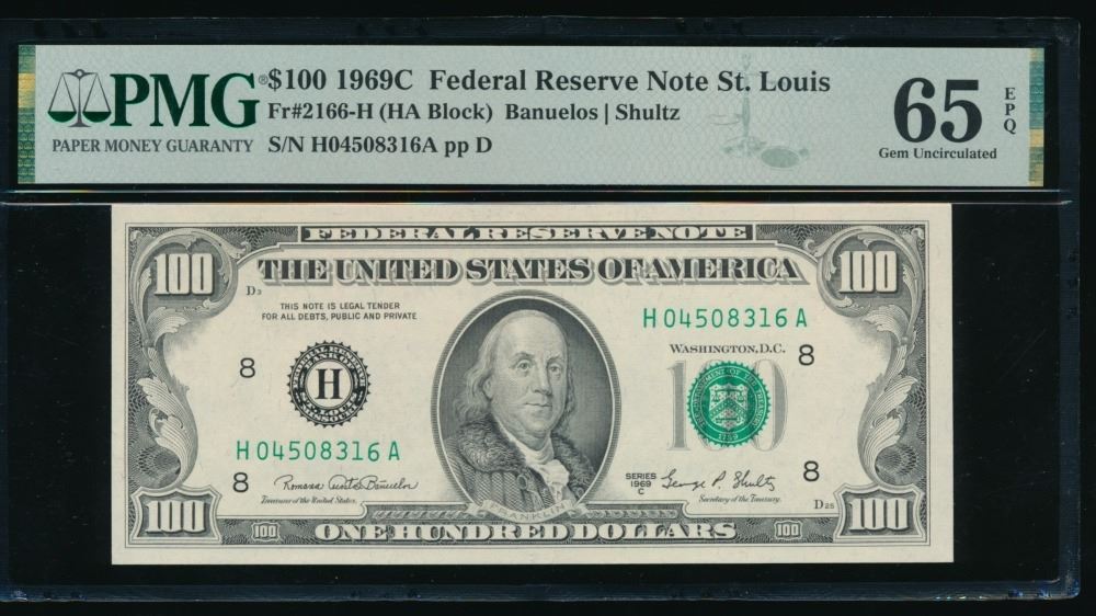 One 1969C $100 St Louis FRN PMG 65EPQ.