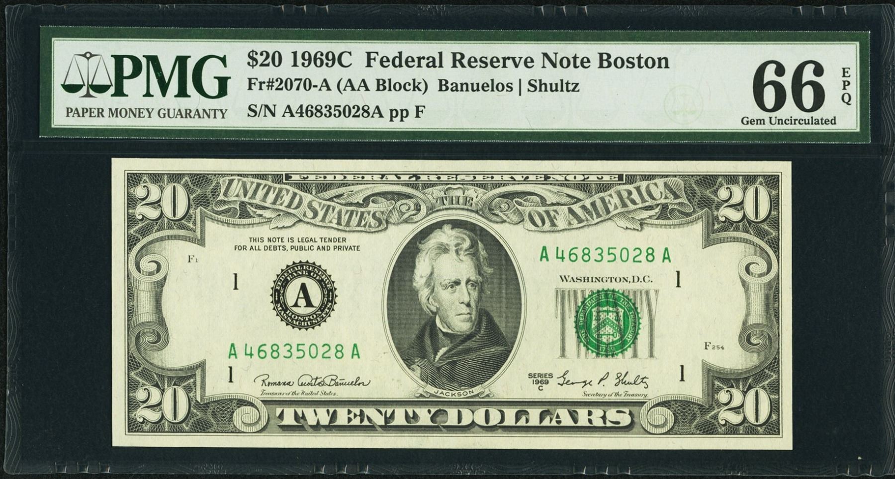 One 1969C $20 Boston Federal Reserve Note PMG 66EPQ.