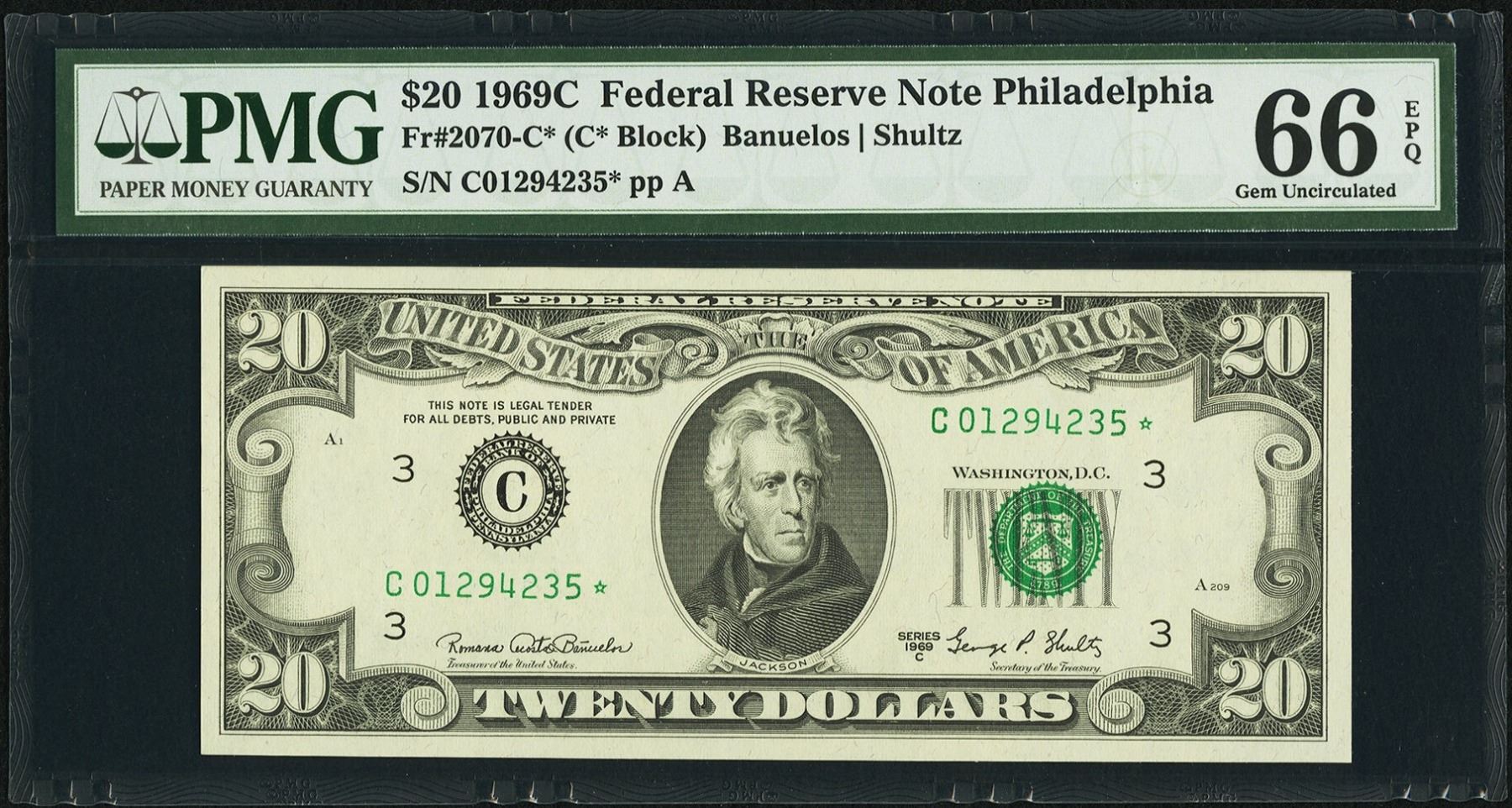 One 1969C $20 Philadelphia Federal Reserve STAR Note PMG 66EPQ.