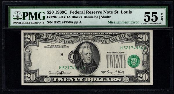 One 1969C $20 St Louis Federal Reserve ERROR Note PMG 55EPQ.