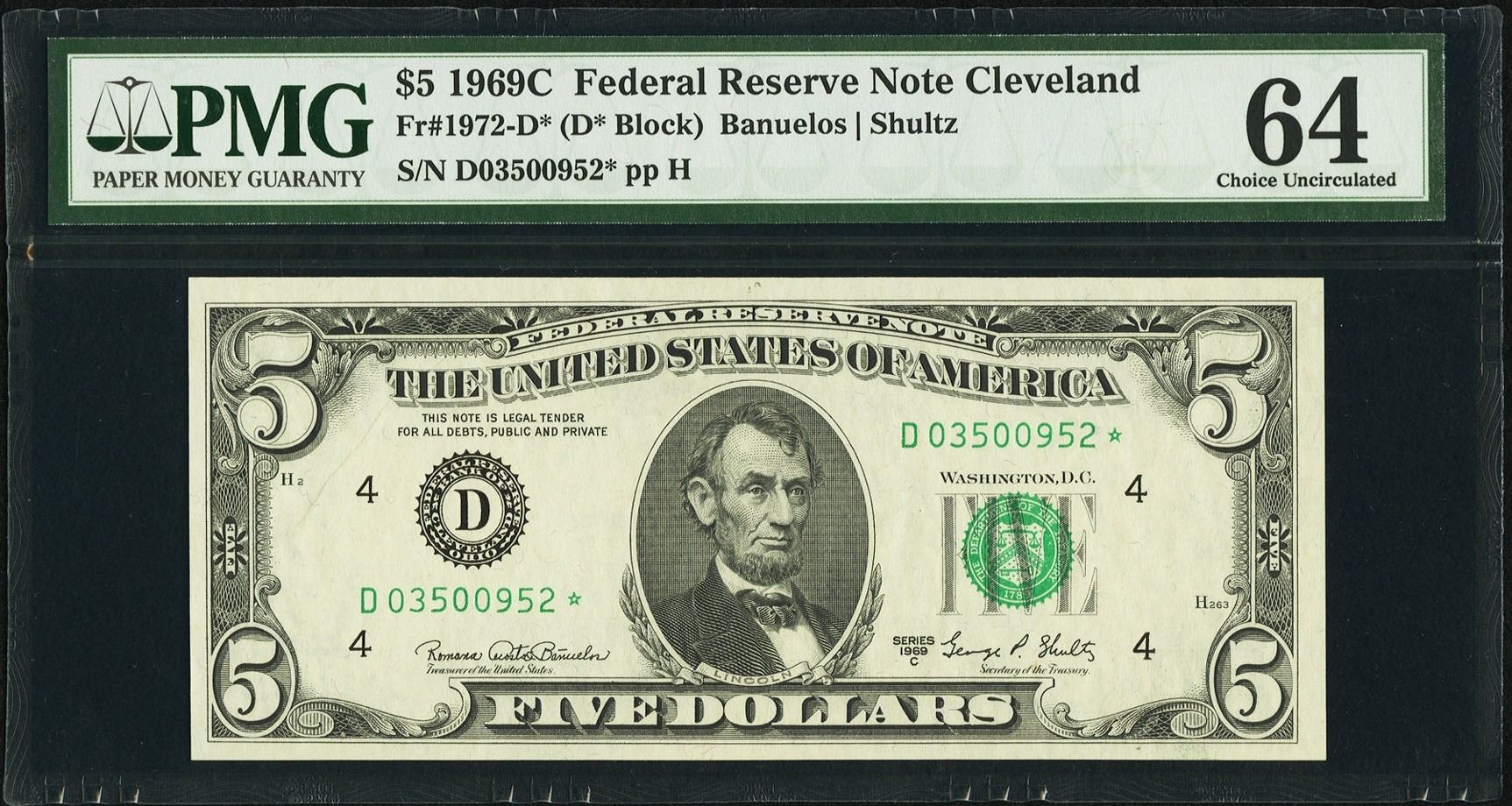 One 1969C $5 Cleveland Federal Reserve STAR Note PMG 64.