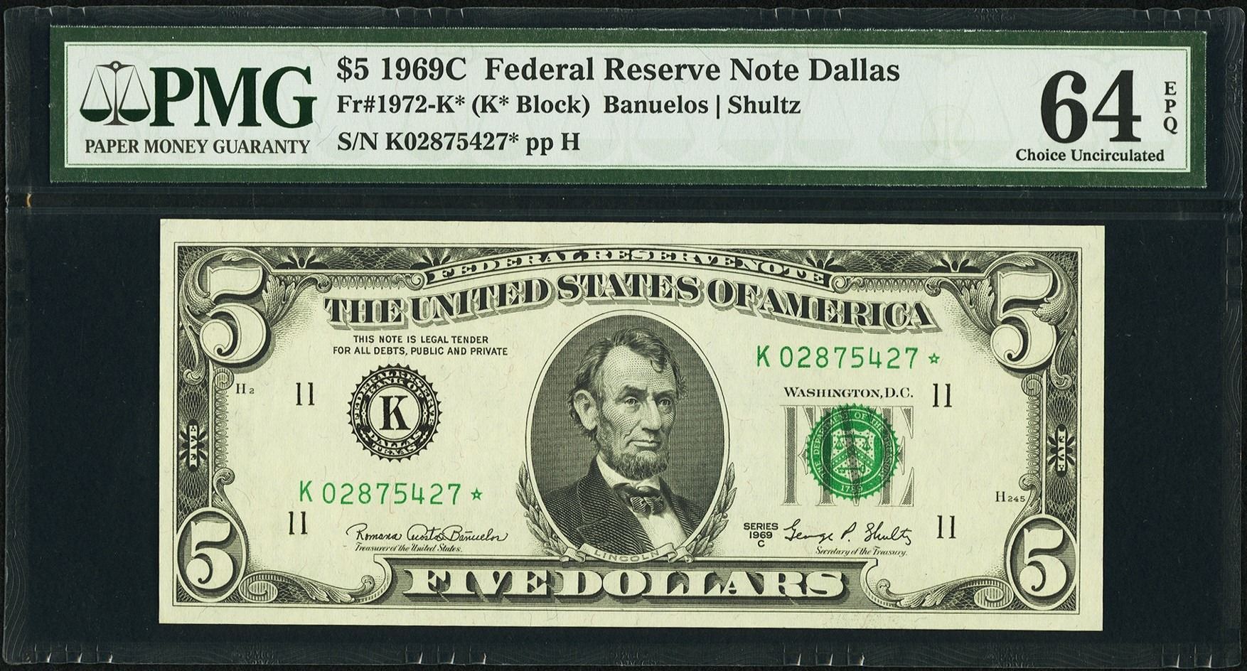 One 1969C $5 Dallas Federal Reserve STAR Note PMG 64EPQ.