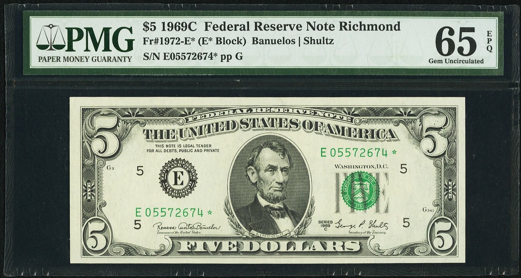 One 1969C $5 Richmond Federal Reserve STAR Note PMG 65EPQ.